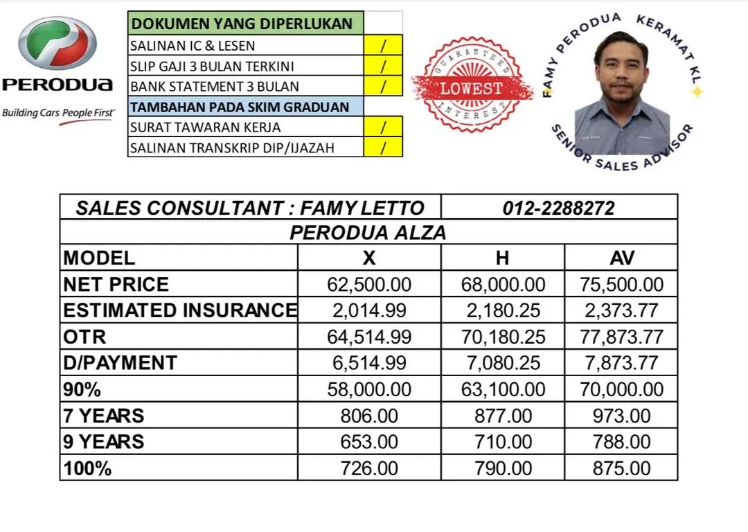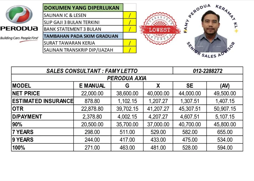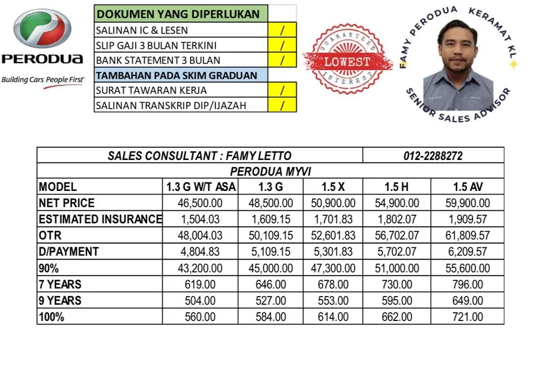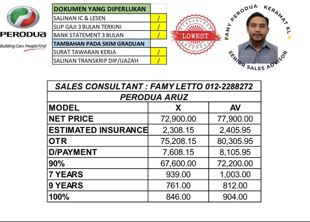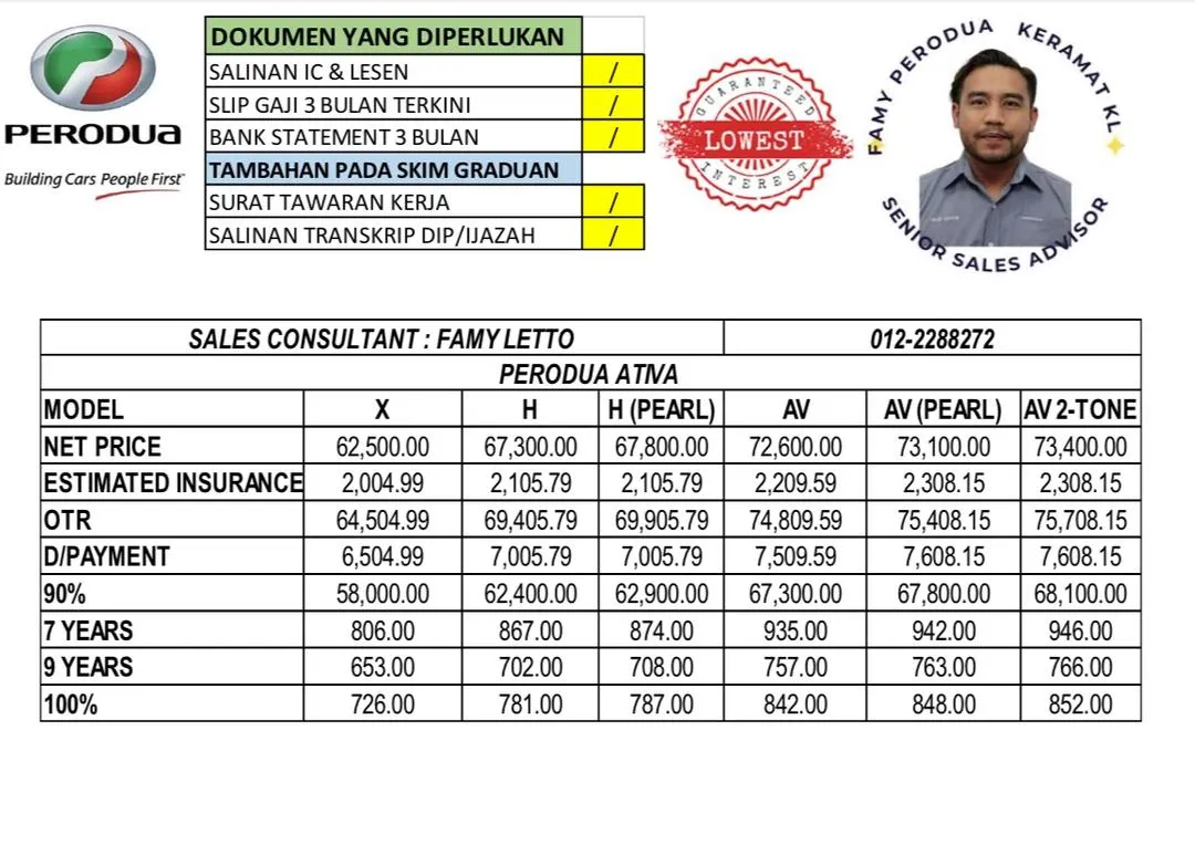 Famy Letto is a registered and trusted Sales Advisor for Perodua Keramat. My services cover the entire Klang Valley and all over Malaysia. I offer a variety of car models and the latest promotions. I have over 16 years of experience as a Perodua Sales Advisor and have successfully helped many customers obtain their dream Perodua cars. I also provide free advisory services to my customers.